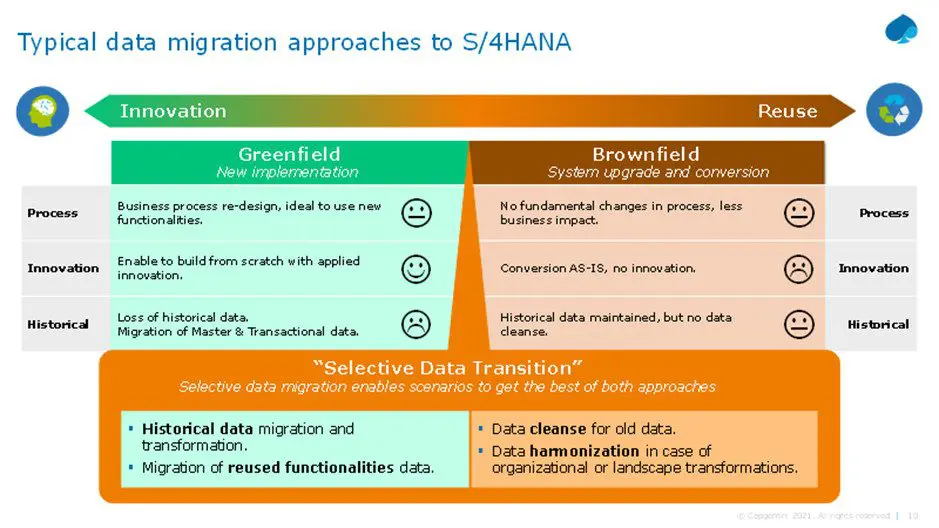 Om elke klant een migratietraject op maat van hun behoeften en ambities te kunnen bieden, heeft Capgemini drie benaderingen uitgewerkt. Met de ‘greenfield’-aanpak kiest de klant voor een volledig nieuwe implementatie, inclusief herontwerpen van processen, om de functionaliteit van het nieuwe platform optimaal te benutten. Een ‘brownfield’-migratie blijft beperkt tot een upgrade en conversie, zonder procesherzieningen, zonder innovatie en met een minimale bedrijfsimpact. Alle historische data blijven bewaard, maar ondergaan geen ‘cleansing’ om de kwaliteit te verbeteren.