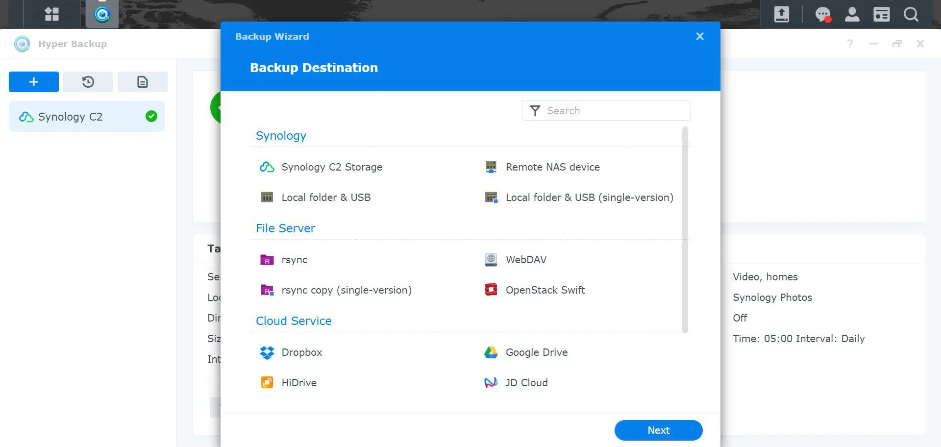 Omdat C2 Storage een dienst van Synology zelf is, is ze compatibel met applicatieback-ups. Je kan zo een back-up nemen van compatibele toepassingen. Begeeft je NAS het en moet je de volledige back-up herstellen, dan moet je die applicaties alvast niet opnieuw configureren.