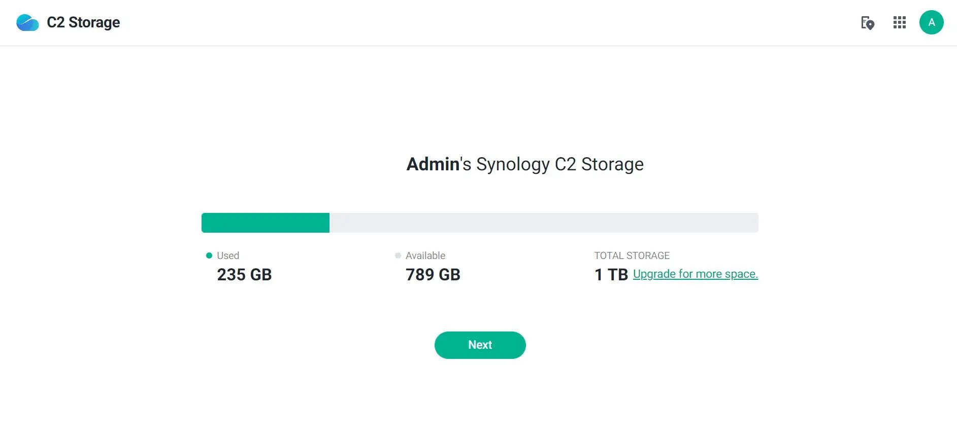 Gewapend met de nodige opslagruimte kan je aan het eigenlijke back-uppen beginnen. Klik in Hyper Backup op het plusteken links bovenaan en selecteer je back-up-bestemming. In een volgend schermlog je in op de clouddienst naar keuze. In het geval van C2 Storage zie je vervolgens hoeveel ruimte je nog ter beschikking hebt.