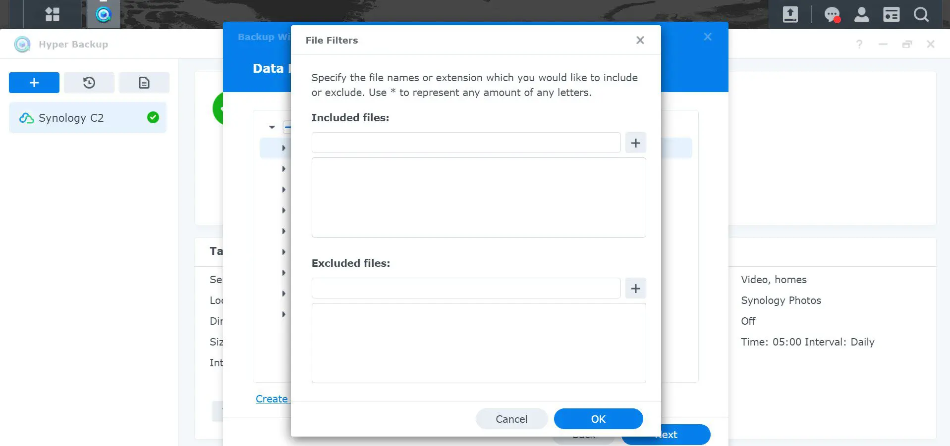 Voor je de back-up kan configureren, moet je nog een naam kiezen voor de taak. Zeker wanneer je meerdere toestellen naar één opslagdienst wil back-uppen, kies je best een duidelijke naam. Het volgende scherm van de Wizard laat je toe de mappen te selecteren die je wil veiligstellen. Je kan hele gedeelde folders back-uppen of individuele subfolders selecteren. Indien je wil kan je zelfs filteren op bepaalde bestandsnamen of -types. Dat is handig wanneer je bijvoorbeeld bepaalde grote maar niet zo belangrijke bestanden uit een back-up wil houden.