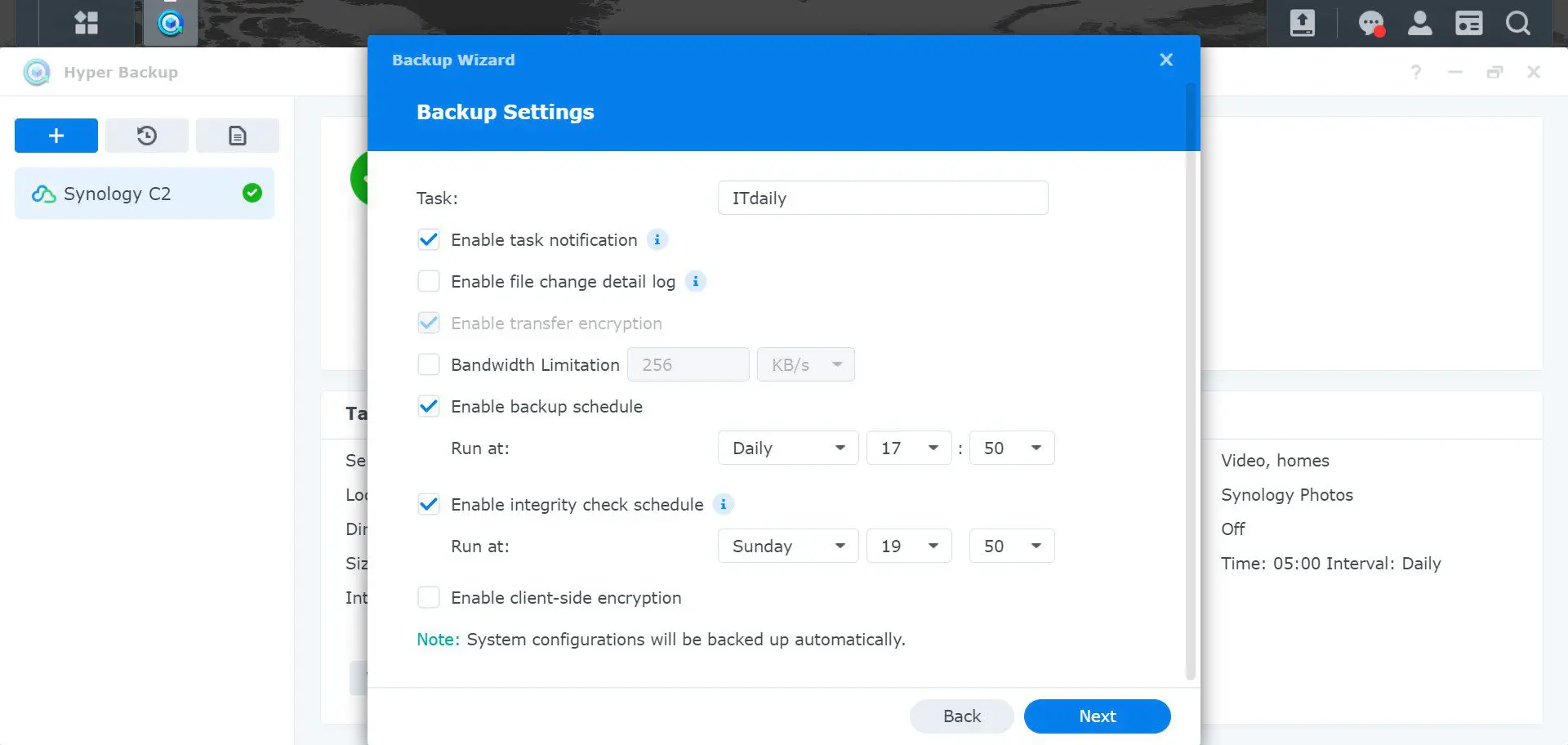In het volgende scherm zie je enkele algemene instellingen. Bovenaan moet je opnieuw een naam kiezen. Dat is de naam die de back-up-taak op je NAS zal krijgen. Verder kan je aanvinken of Synology van iedere back-up moet bijhouden welke bestanden er veranderd zijn én is het mogelijk om de beschikbare bandbreedte voor back-ups te beperken. Vervolgens kies je je back-up-frequentie, al is er weinig reden om niet gewoon dagelijks te kiezen. Daarnaast is de optie Enable integrity check schedule belangrijk. Daarmee kijkt Synology na of de back-up ook daadwerkelijk in goede staat is, zodat je later niet voor een onaangename verrassing komt te staan.
