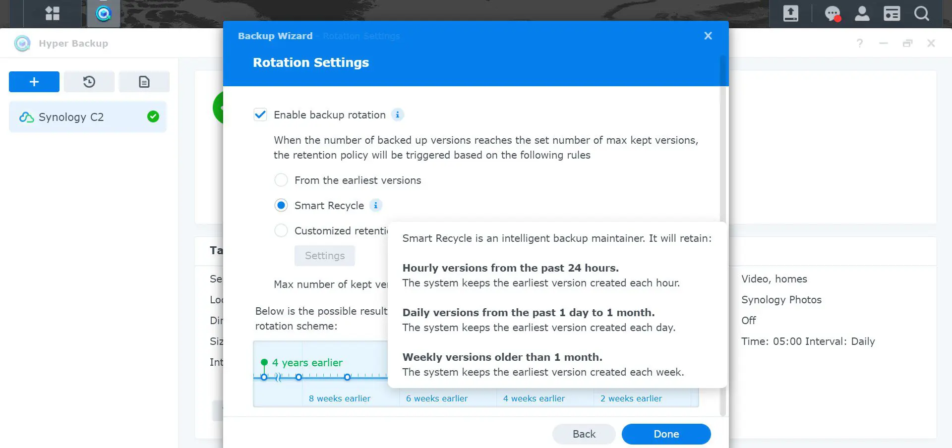 Smart Recycle biedt een interessanter alternatief. Daarmee verwijdert Synology opnieuw vanzelf oudere versies, maar volgens een specifiek schema. Van de laatste 24u blijft er telkens per uur een back-up beschikbaar. Van de laatste maand houdt Hybrid Storage automatisch één versie bij. Voor back-ups ouder dan een maand wordt enkel de eerste back-up van de week bijgehouden.
