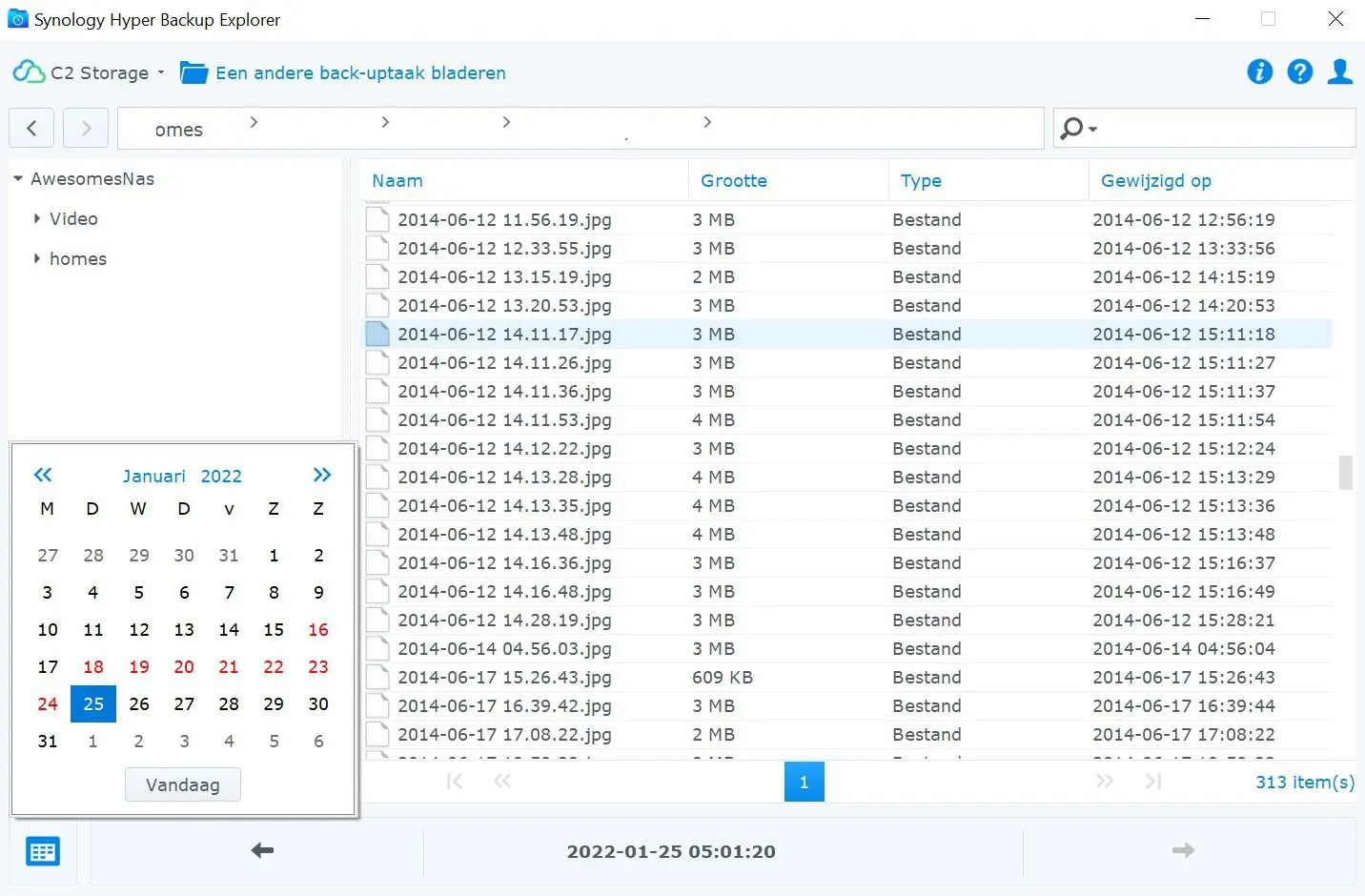 Je krijgt nu een soort verkennervenster waarmee je door de back-up kan bladeren. Dat gaat natuurlijk niet zo snel. Links onderaan kan je via het kalendericoontje eerdere versies van je back-ups selecteren. Om de één of andere reden zien datums waarvan er een back-up beschikbaar is er telkens alarmerend rood uit. Je kan bestanden niet rechtstreeks openen in de Hyper Backup Explorer, maar je kan ze wel downloaden naar je pc. Klik daartoe rechts en selecteer de enige optie: Kopiëren naar. Die functie werkt ook op het niveau van mappen.