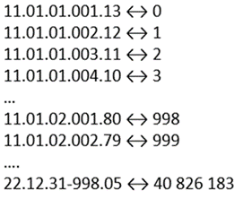 Vertrekkende vanaf een vrij te kiezen startdatum – bijvoorbeeld 01/01/1911 – kennen we aan elke correct gevormde string een unieke index toe, startend bij 0 en oplopend, zoals aangegeven in onderstaande figuur. We kunnen ophouden bij, bijvoorbeeld, 31/12/2022. In dat geval zijn we zeker dat de rijksregisternummers van alle personen ingeschreven in het Rijksregister die eind 2022 in leven waren een conversie van en naar een getal hebben. Niemand in dit land is immers ouder dan 112.