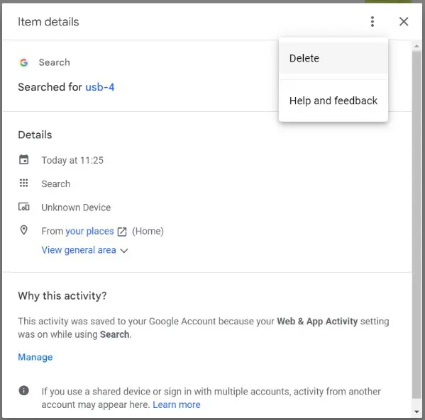 Om je individuele activiteiten te verwijderen, klik je naast een bepaalde activiteit op de drie verticale puntjes en selecteer Verwijderen om die specifieke activiteit te wissen.