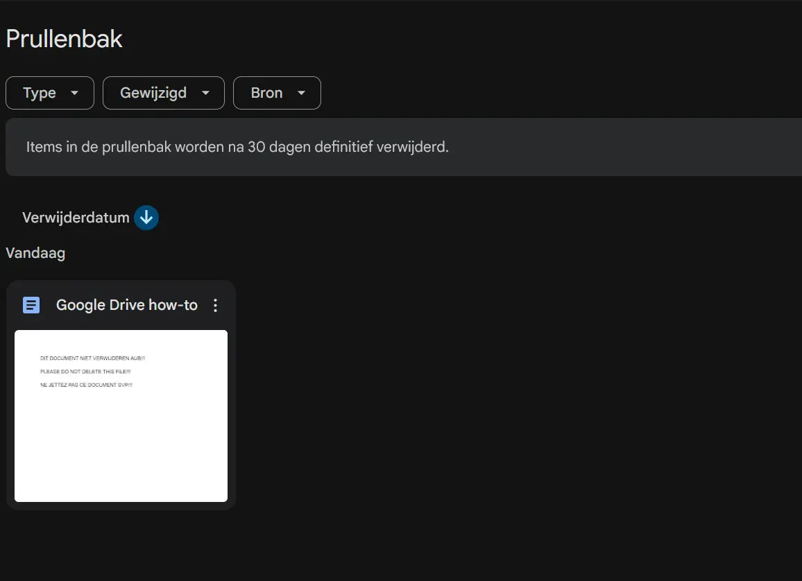 Geen nood als je er niet op tijd bij was: Google Drive houdt verwijderde bestanden nog dertig dagen bij. Die zitten in de prullenbak. Zoek je bestand en open het actievenster. Selecteer nu vooral niet Definitief verwijderen, want dan ben je het bestand kwijt. De knop Herstellen zet het weer op zijn originele plek.