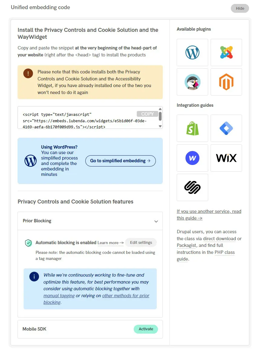 Wanneer WayWidget geactiveerd is, krijg je een stukje JavaScript-code die je moet gebruiken om de widget op je site te installeren.