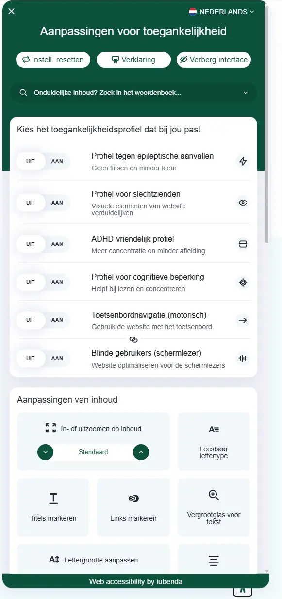 Pas dan werkt de widget correct.Klik op het icoon om te testen: kan je bv. contrast veranderen, toegankelijkheidsopties zien, of tekst van kleur veranderen?