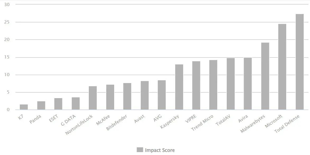 AV-Comparatives werkt daarvoor met een puntensysteem. K7 heeft een impactscore van 1.6 en Panda 2.5. Voor Kaspersky is de impactscore al 13 en Microsoft Defender klokt af op 24,6. Rode lantaarn Total Defense haalt 27,4.