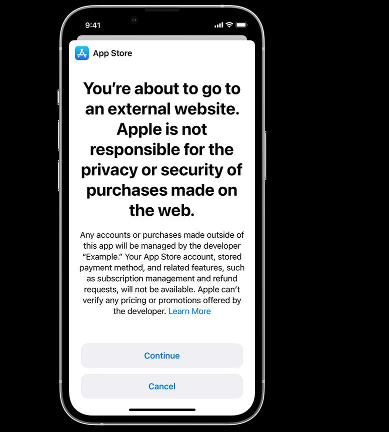 Dat zal wel volgens de regels van Apple verlopen. Zo moeten ontwikkelaars nog altijd wel eerst expliciete toestemming van Apple verkrijgen om een externe link te mogen toevoegen, en moet de optie om betalingen binnen de App Store af te ronden blijven worden aangeboden. Klikt de gebruiker op een link, dan krijgt die in koeien van letters een waarschuwing dat hij/zij de beveiligde omgeving van de appwinkel verlaat en Apple niet verantwoordelijk is voor wat er dan kan gebeuren.