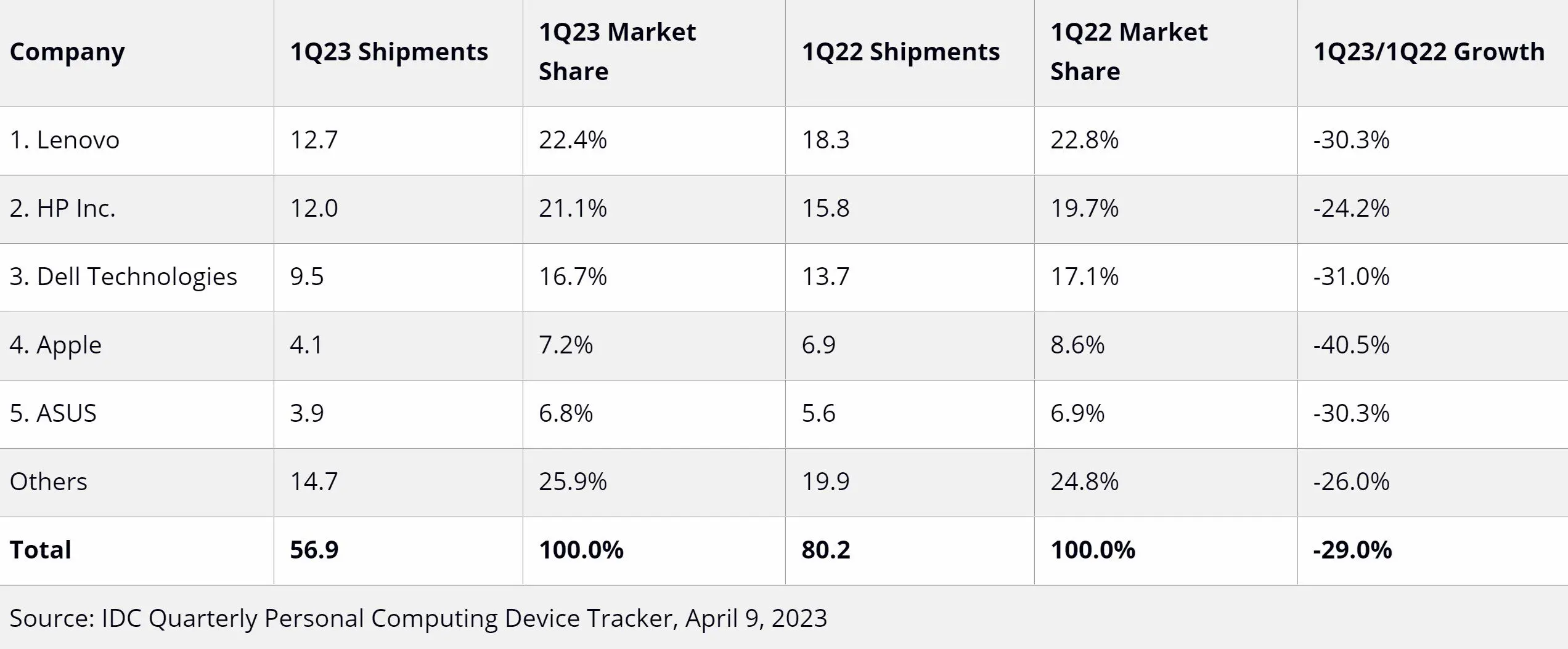 Het huidige kwartaal liet zich voelen bij alle fabrikanten. Lenovo is op dit moment de grootste OEM met 12,7 miljoen verscheepte laptops, maar zag zijn verkocht volume dalen met 30,3 procent. HP staat op plaats twee met 12 miljoen verkochte computers, goed voor een daling van 24 procent. Dell komt pas op de derde plaats met de grootste daling van alle professionele fabrikanten: 31 procent minder verkochte pc’s brengt Dell op 9,5 miljoen verkochte units. Tot slot vermelden we Apple nog, dat van alle computerbouwers het hardst getroffen werd. 4,1 miljoen toestellen vertrokken uit te fabriek: 40,5 procent minder dan een jaar eerder.