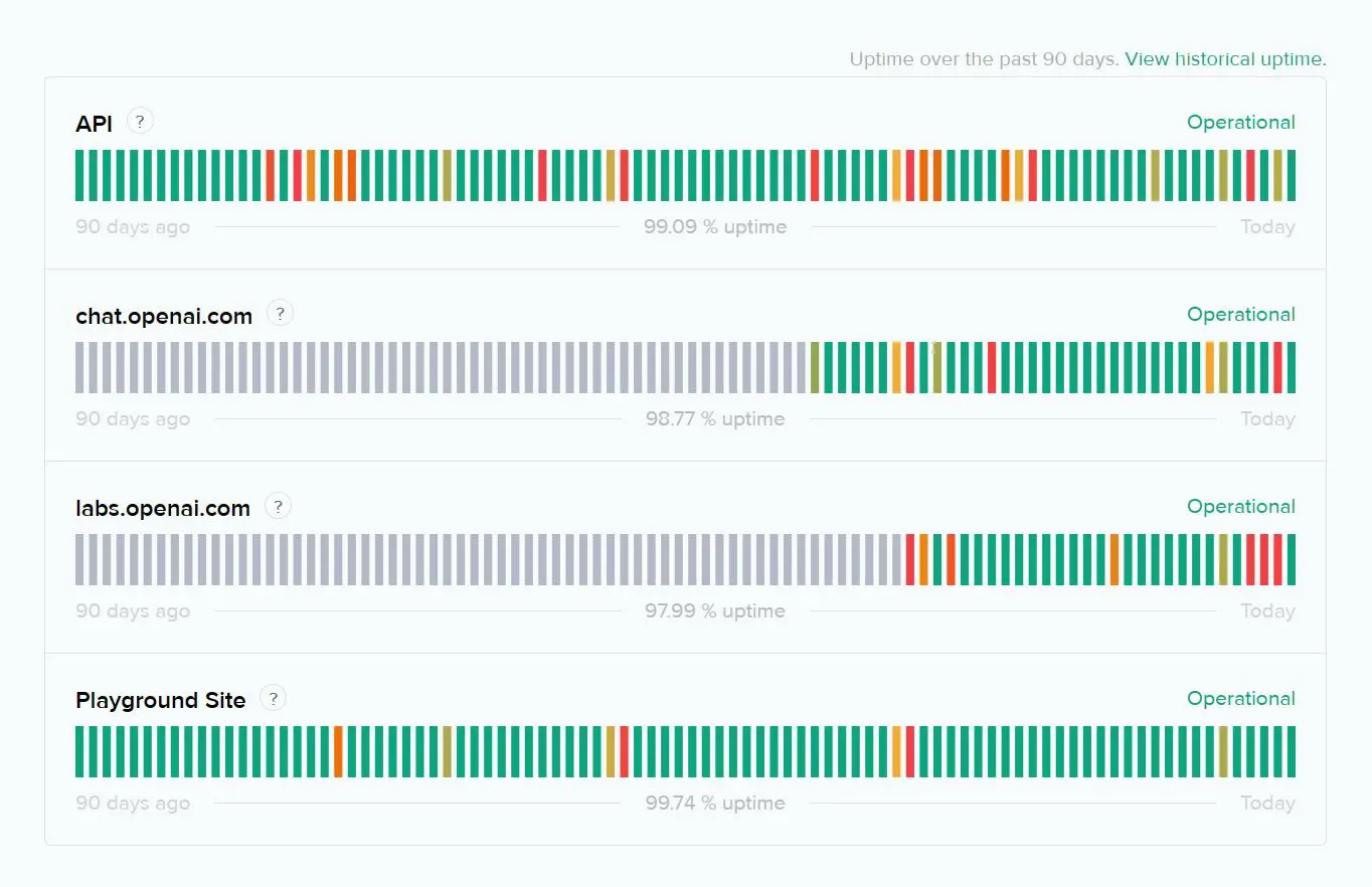 OpenAI worstelt regelmatig met de capaciteit van ChatGPT omwille van de populariteit van de dienst. Je kan op de historiekpagina zien dat vooral de API het regelmatig moeilijk heeft om alle vragen af te handelen.