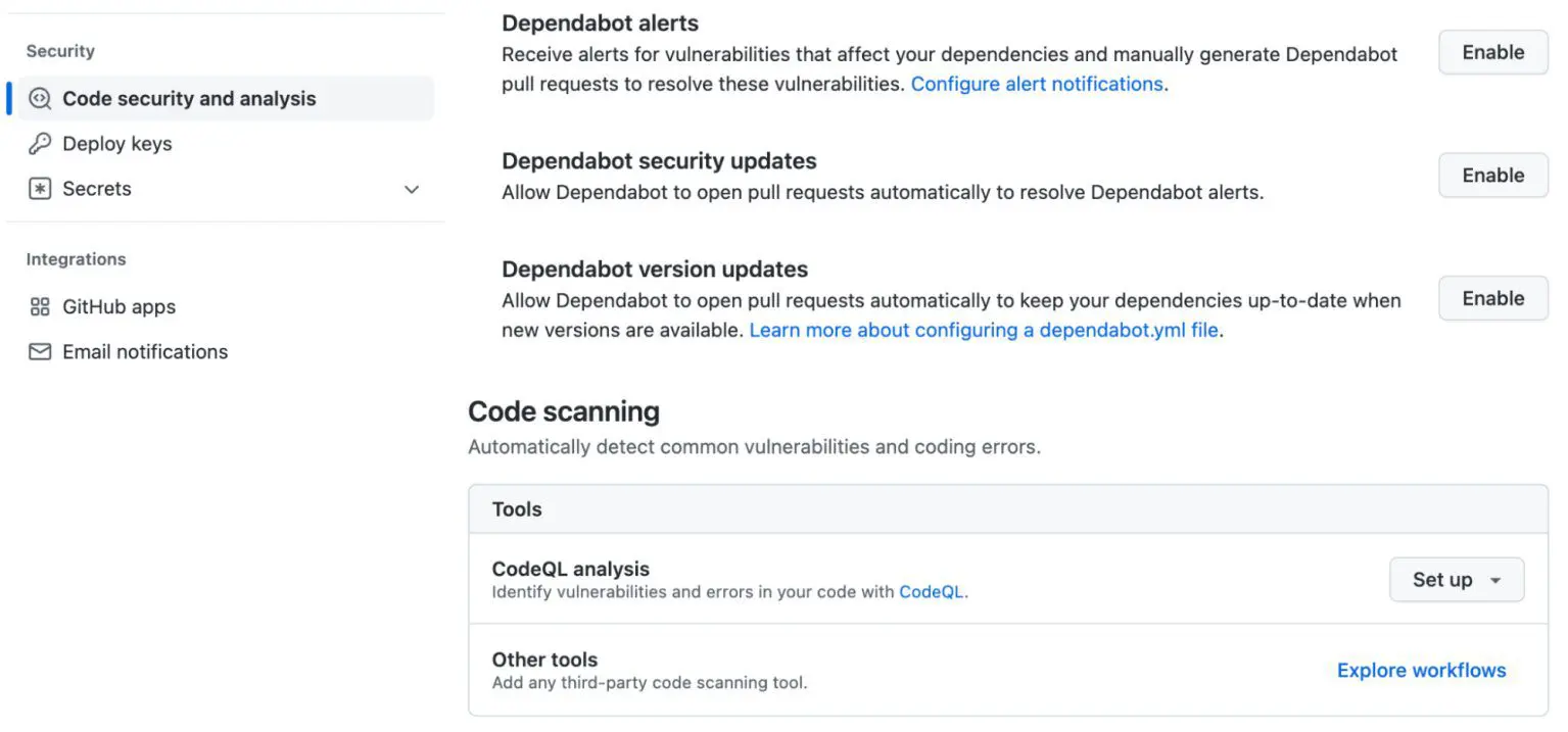 GitHub kondigt de aanpassingen aan met een blogpost. Ontwikkelaars kunnen via de instellingen CodeQL-analyse standaard aanzetten voor al hun publieke repositories. Daarmee kan je code laten scannen op potentiële kwetsbaarheden terwijl je er in aan het werken bent, zonder .yaml-confiugratiebestand te hoeven instellen. Op die manier komen achilleshielen sneller aan het licht, zonder de workflow te verstoren.