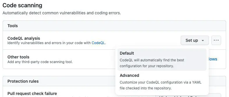 In slechts enkele muisklikken laat je CodeQL je codes analyseren. Open het menu Code security en analyse onder de beveiligingssectie in de instellingen van een repository. Onder Code Scanning zal CodeQL-analyse al standaard ingesteld staan als dit beschikbaar is voor je code. Door dit te veranderen naar Advanced kan je nog op de oude manier met .yaml-bestanden blijven werken.