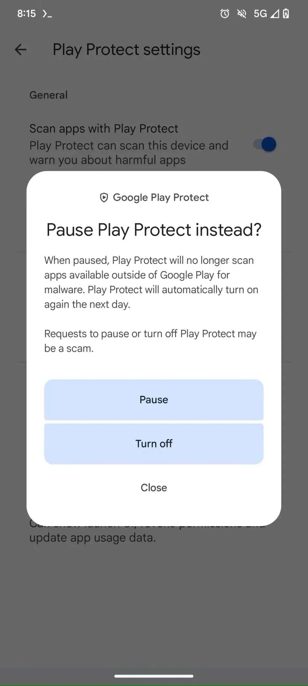 Google lanceert een ‘Pause Play Protect’-functie, zodat gebruikers het scannen op malware voor sideloaded apps tijdelijk kunnen uitschakelen.