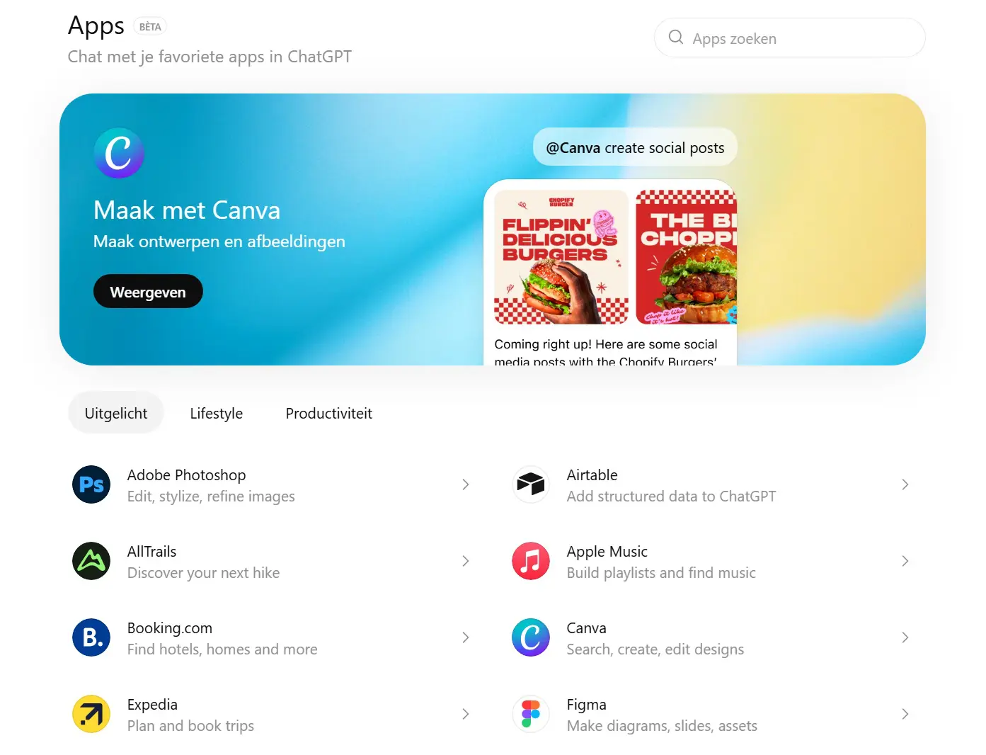 Externe ontwikkelaars kunnen vanaf nu apps indienen om ze na beoordeling te laten verschijnen in ChatGPT. Gebruikers krijgen tegelijk een app-directory om apps te zoeken en te starten.