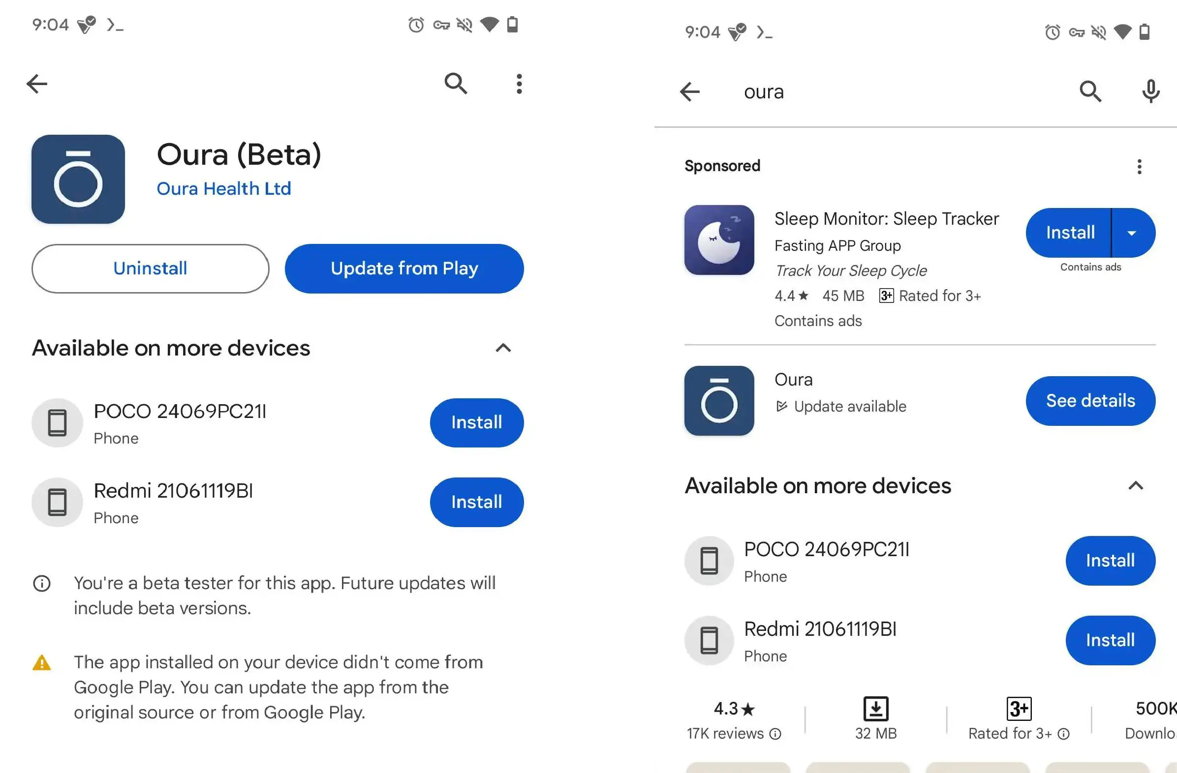 In onderstaande screenshots van Android Authority zie je links de knop ‘Update from Play’ bovenaan weergegeven, in de rechtste afbeelding verschijnt er onder de externe app dat er updates beschikbaar zijn die via Play Store gedownload kunnen worden.