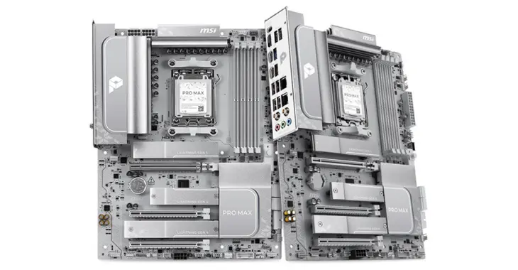 Tot slot vinden we losse pc-componenten terug in de Pro Max-familie. Die onderdelen zijn eveneens wit en passen perfect bij het design van bovenstaande toestellen. Eerst en vooral hebben we het Pro Max X870E-A Wifi-moederbord dat Wifi 7 en USB-C ondersteunt, en compatibel is met de recentste AMD-processors.