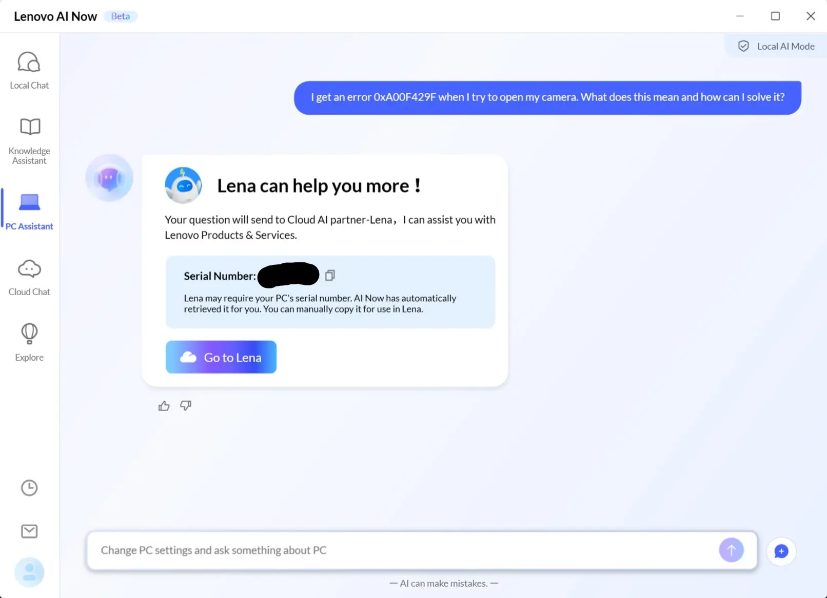 Tijdens een conversatie wilde AI Now ons plots voorstellen aan Lena, de chatbot van de klantendienst van Lenovo. AI Now had zelfs het serienummer van onze laptop netjes voor ons opgezocht. Lena is echter alleen bereikbaar in de cloud en niet beschikbaar in de Benelux, dus ze kon ons helaas niet verder helpen.
