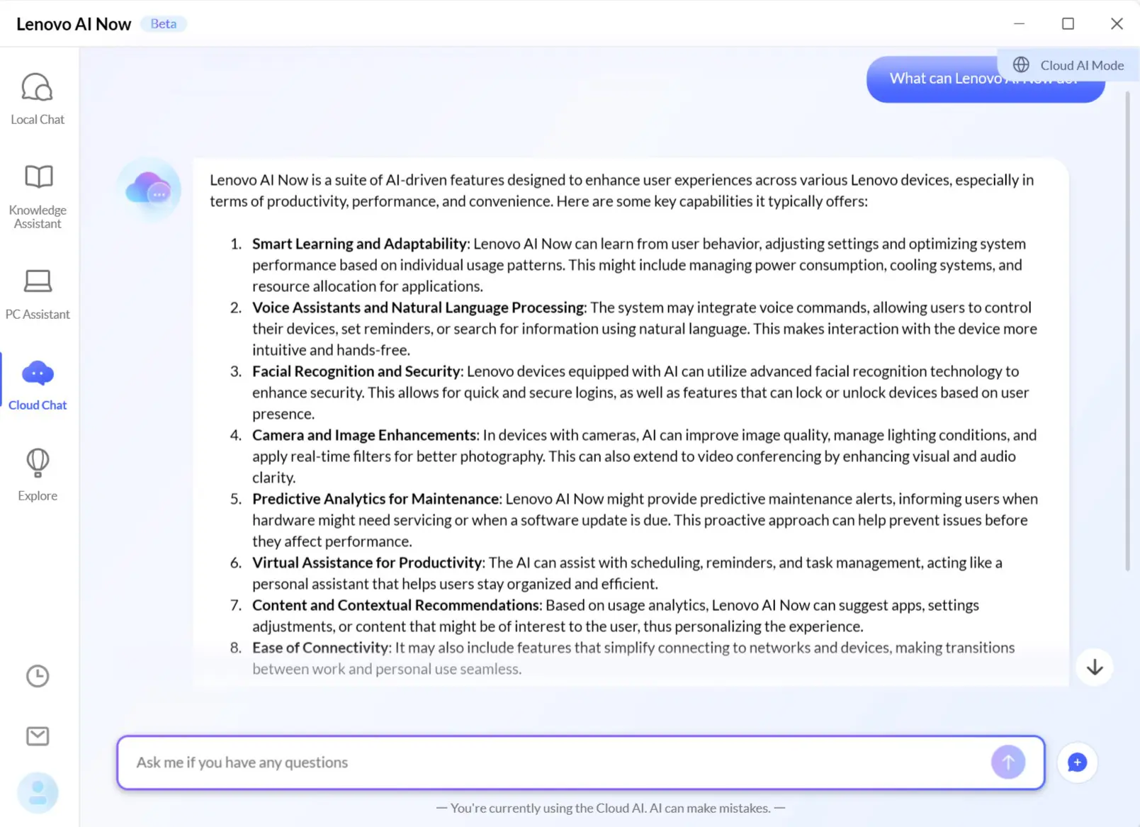 Het vierde en laatste menu is Cloud Chat, wat een cloudversie van AI Now is. Weet de lokale versie het niet, dan stelt die bijna altijd voor om het aan zijn cloudbroer te vragen. AI Now kijkt ook mee in applicaties zoals Word en kan je uitleg geven bij tekst die je markeert. Via de cloud geeft het snellere en meer uitgebreidere antwoorden, maar het staat eigenlijk haaks op de verkoopbelofte van Lenovo.
