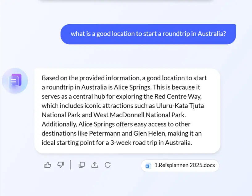 In onze Knowledge Base zaten diverse bestanden, van notities van een rondetafel over AI, pdf-rapporten, interviews, interne spreadsheets tot een persoonlijk document met reisinformatie over Australië. We vroegen naar een definitie van AI of om reisadvies te geven en AI Now wist meteen in welk bestand het de juiste informatie moest gaan zoeken. Het voordeel van AI Now is dat je het bestand niet moet delen met de cloud. Via de historiek kan je je chatgeschiedenis leegmaken.