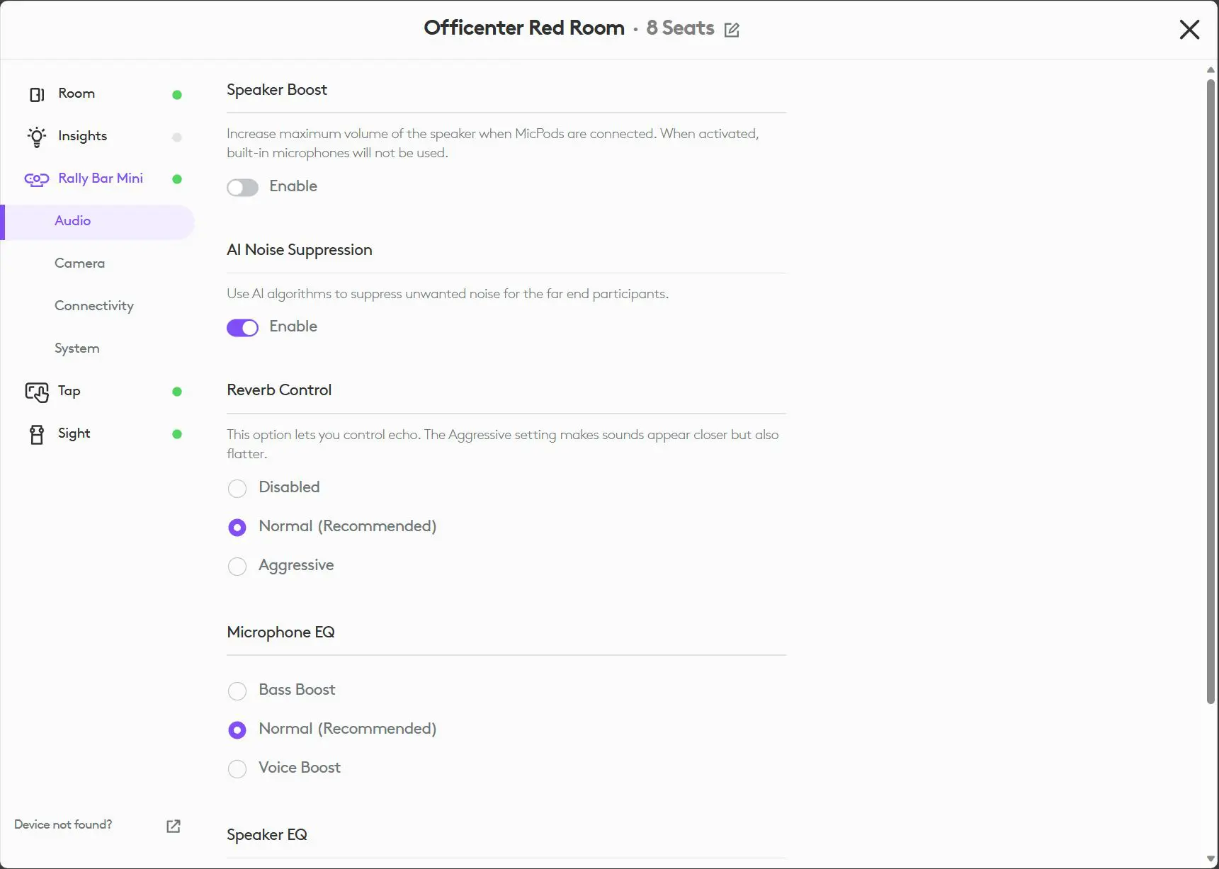 Tijdens onze installatie hebben we een uur zitten configureren, maar kregen we de functie niet aan de praat. Het probleem? Ondergetekende zat alleen in de ruimte, waardoor de Logitech Sight niet in actie schiet. Omdat je alleen bent, kijk je automatisch naar het scherm en kan de Rally Bar inzoomen op jou om je zo optimaal in beeld te brengen. Logisch achter afgezien, maar daarom niet minder frustrerend op het moment zelf.