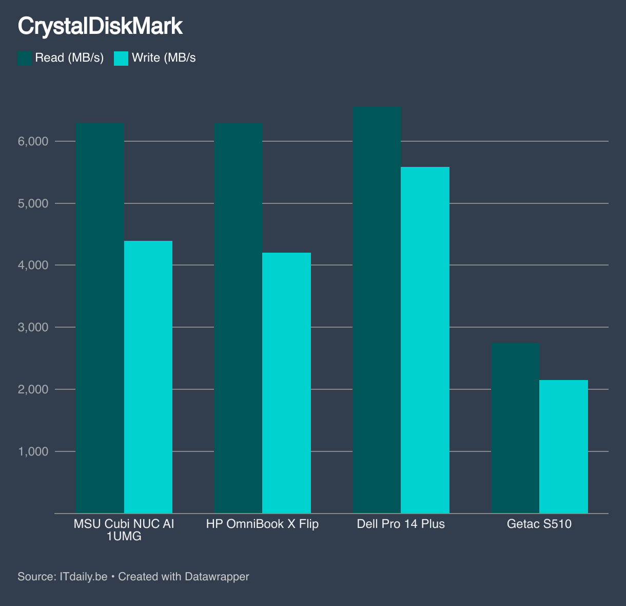 De hele gebruikservaring loopt vlot. Dat komt onder andere door de adequate 16 GB RAM maar ook omdat MSI niet bespaart op de SSD. Die scoort zoals je kan zien op het niveau van veel duurdere toestellen.