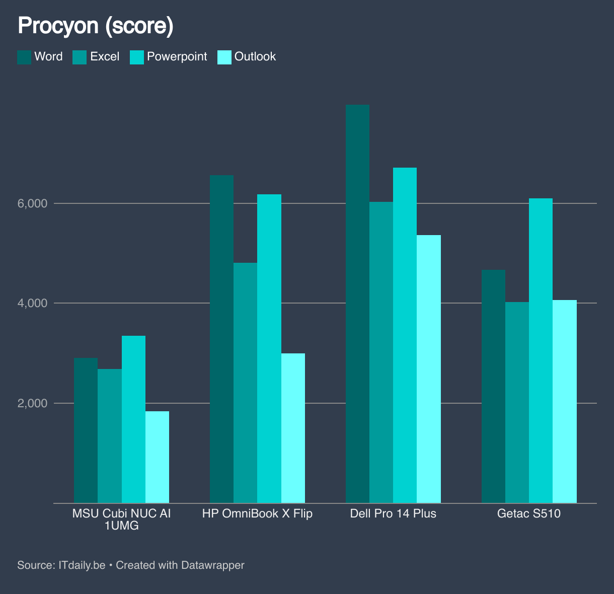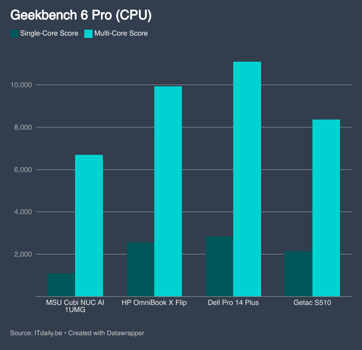De HP OmniBook X Flip heeft een Intel Core Ultra 5 226V aan boord: die chip is van een recentere generatie en doet het logischerwijze beter. De Dell Pro 14 Plus speekt met de Core Ultra 7 268V weinig verrassend in een hogere categorie. Toch scoort ook de Getac S510 iets hoger, hoewel de Core Ultra 5 125U op papier geen krachtigere chip is.
