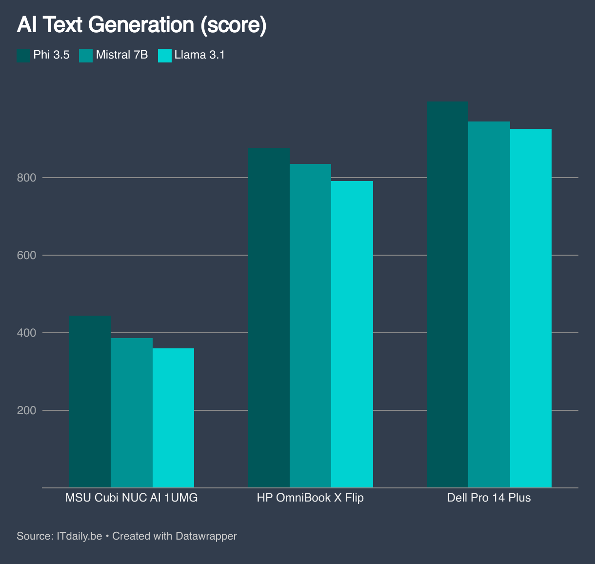 MSI zet wel sterk in op de lokale AI-component bij de marketing van de MSI Cubi NUC AI 1UMG, dus onderwerpen we de kleine computer aan onze benchmarktest voor tekstgeneratie via AI. We testen drie modellen.
